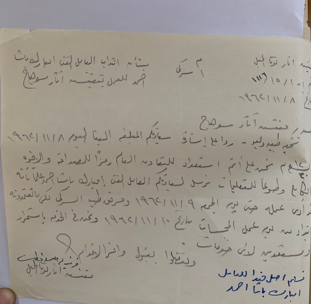 His file tells us that he started as a temporary ‘excavation technician’ or archaeologist with Cairo University in November 1946, and worked on their excavations at Tuna el-Gebel in 1959, before being transferred to the Inspectorate of Minya in May 1960. In 1963, he sent a request to the Antiquities Service asking to be promoted to a rais due to his excellent excavation experience – a request that was sadly denied as the Service claimed to have no vacant positions to offer. This, however, seems to have changed a few years later when his is referred to as a rais in all the correspondence.